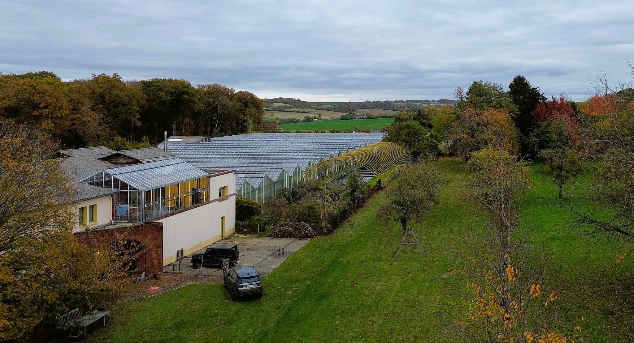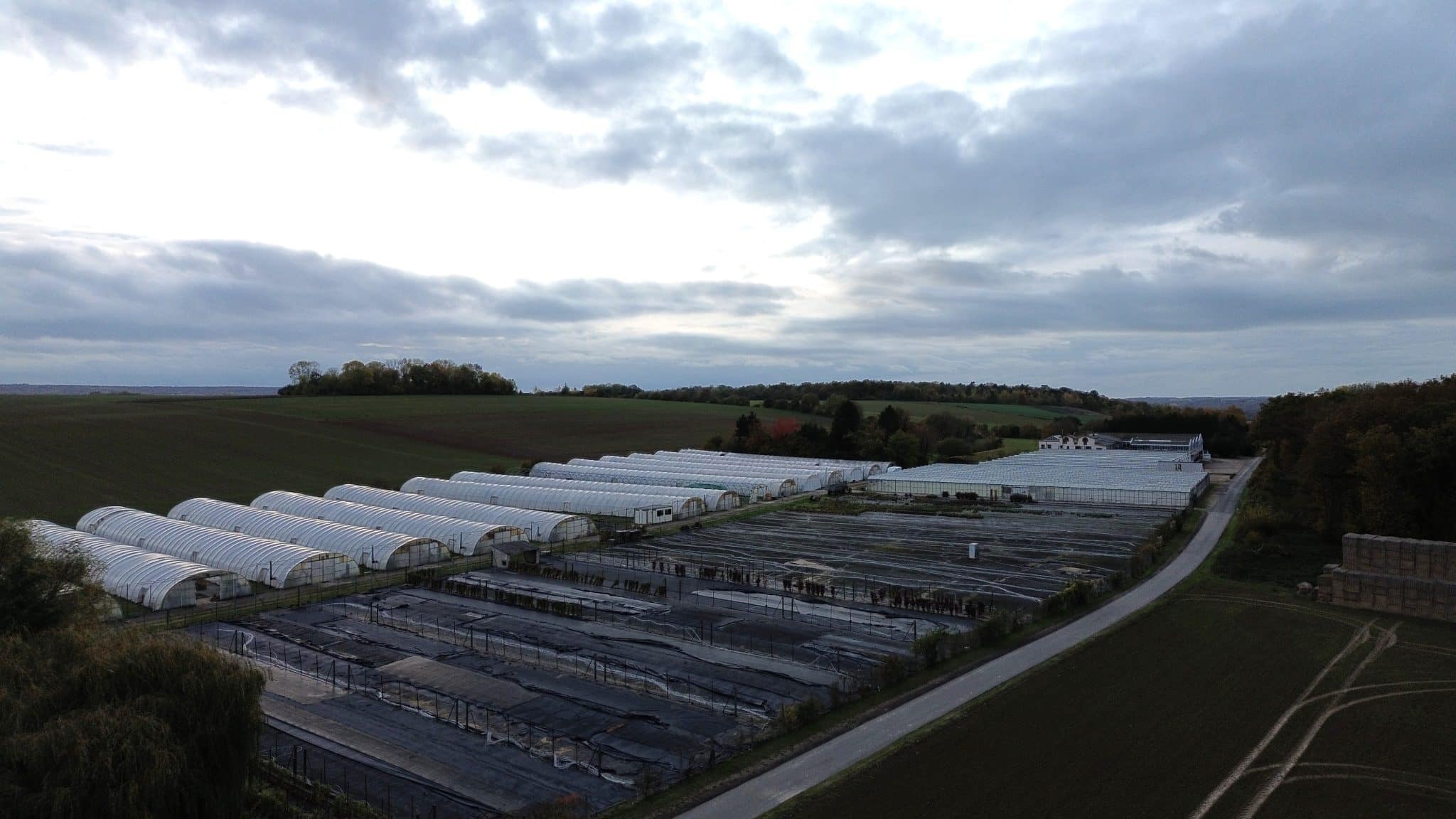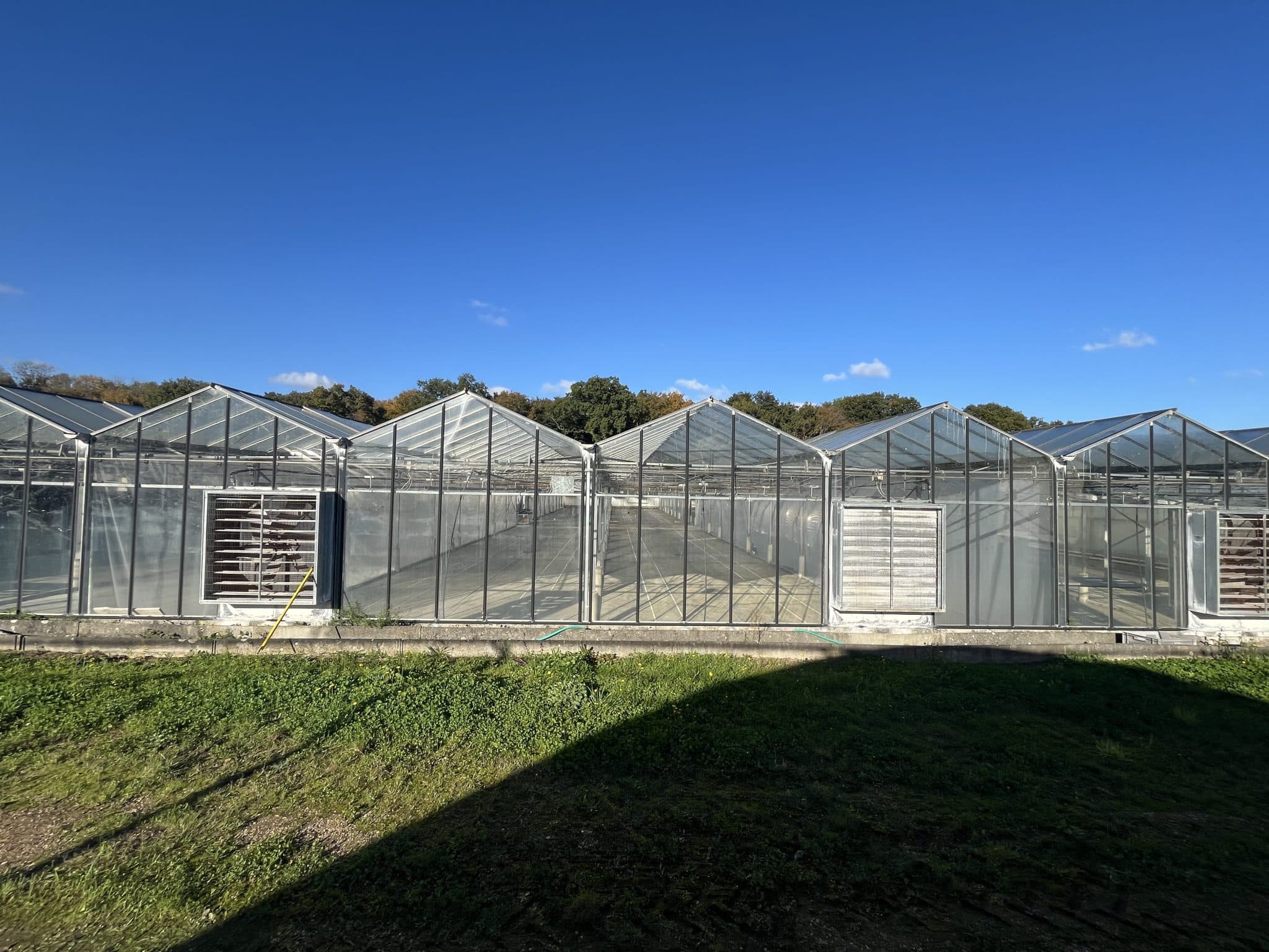 un bâtiment d’exploitation incluant : 6 000 m² de serres en verre, 17 serres tunnel